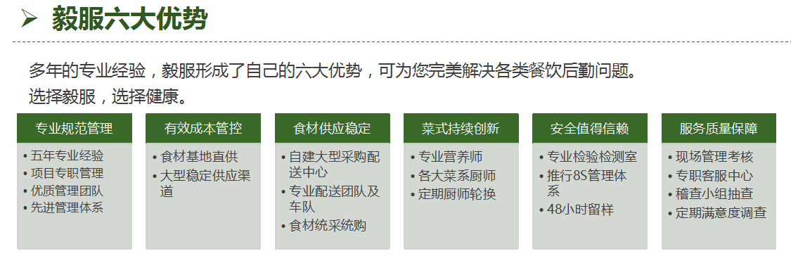 我司自成立以来,经过多年的努力,建立了一整套先进规范的管理体系,培养了大批专业的高素质的管理人才,所有厨师、厨工都经过专业的培训,得到广大客户的一致称赞。